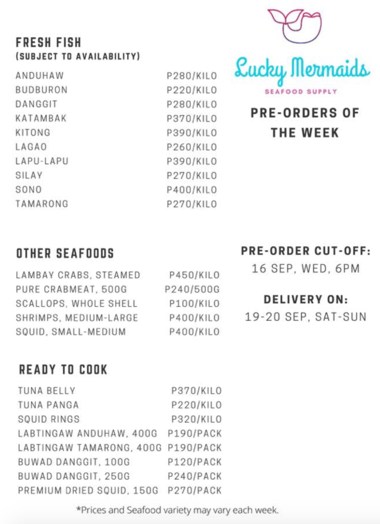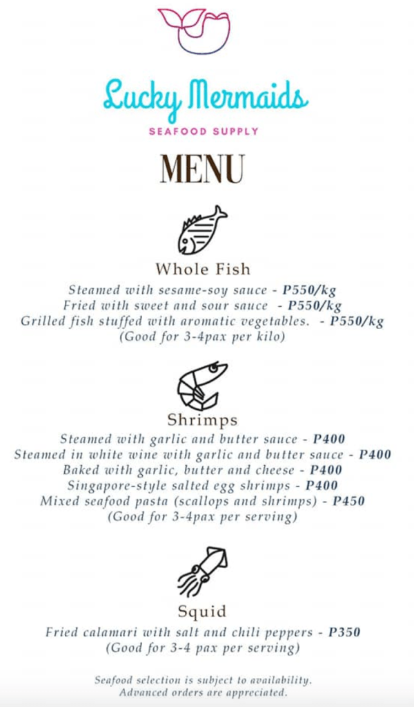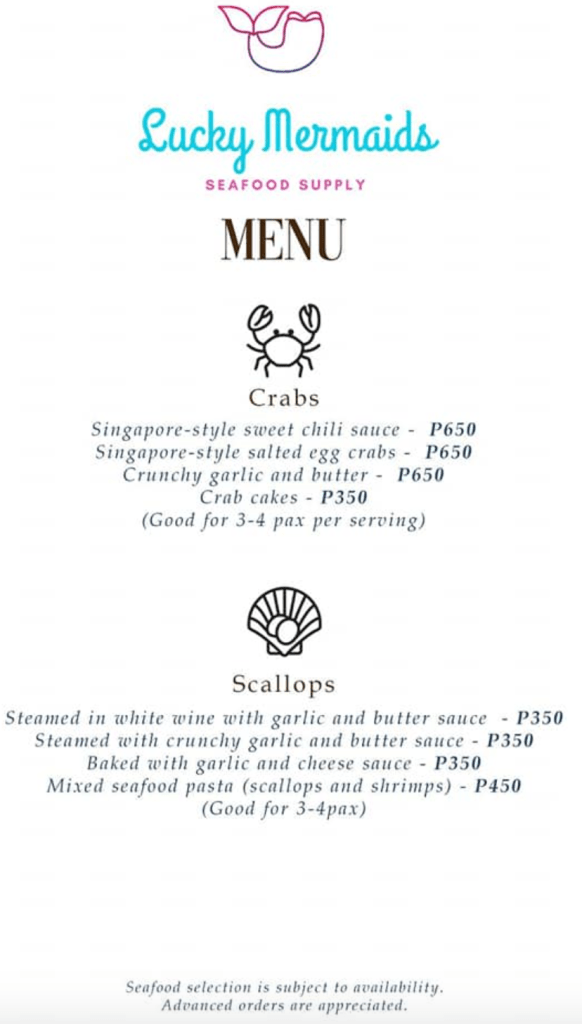 Lucky Mermaids supply fresh fish and other seafood such as scallops, squid, and crabs. All of these are available for delivery in Cebu via Lalamove and Maxim. They also have pa-luto seafood menu good for 3-4 persons, which is subject to availability like the fresh fish and seafood too. Fresh bounties of the sea are pre-ordered by Wednesdays and deliveries every Saturdays and Sundays.